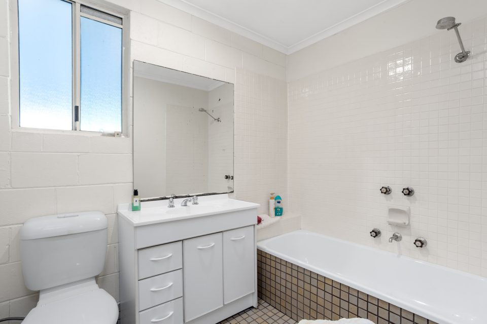 The modern kitchen comes equipped with stone benchtops, a stainless steel electric cooktop/oven, and soft-close cabinetry.