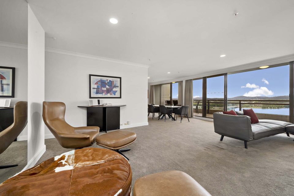 “The apartment is set on the building’s outward curve, meaning it has a 180-degree view with Black Mountain on the right, the National Gallery, the National Museum, Parliament House, and you can see as far as Russell. It needs to be seen to be believed,” LJ Hooker Dickson agent Nic Salter-Harding says.