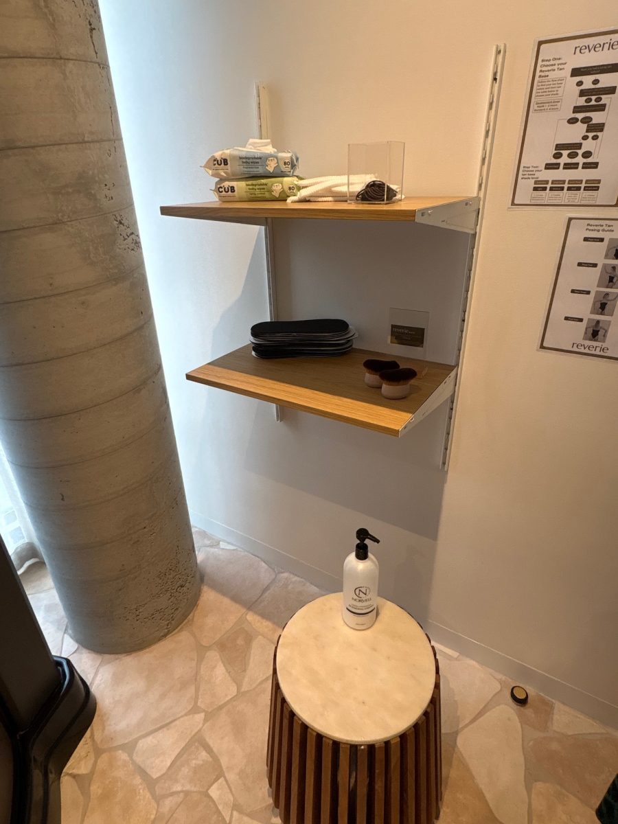 When I arrive at Reverie in Campbell (it’s just down from Teddy Picker’s), I use the app to let myself in. The space itself is beautiful in that perfect-aesthetic/smells amazing way, and I head to the Automated Tanning Studio. I see no-one.