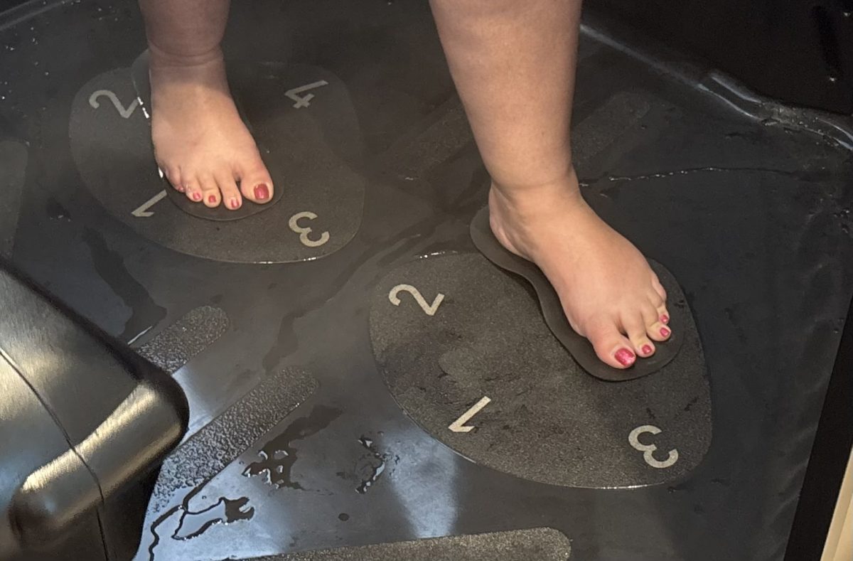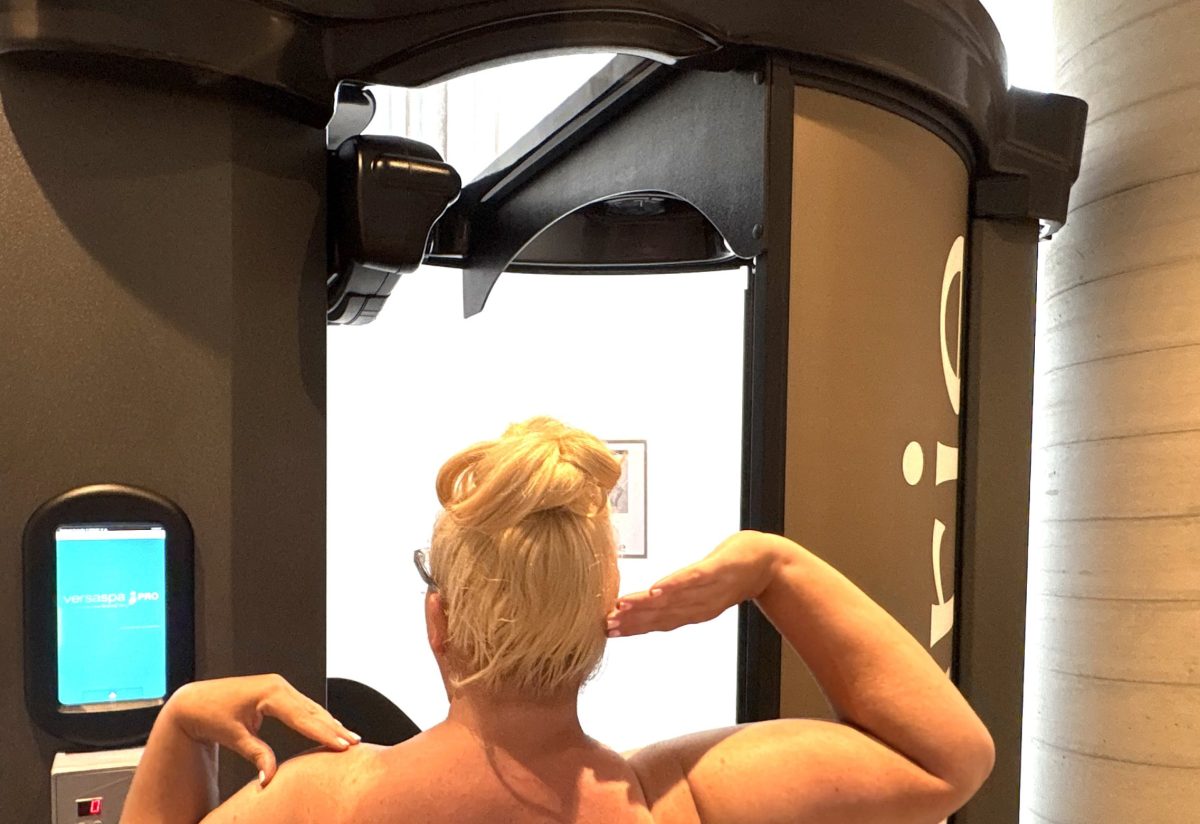 I pop the sticky feet on, plug my number (8) into the side panel and hop in. But I suddenly remember I still have my glasses on. I take them off and have a minor panic attack because … I can’t see! If there are buttons to press or more instructions to read in the booth, I’m cooked. I’m panicking because what if it starts spraying and I’m squinting and sweating at the same time and it just goes everywhere?