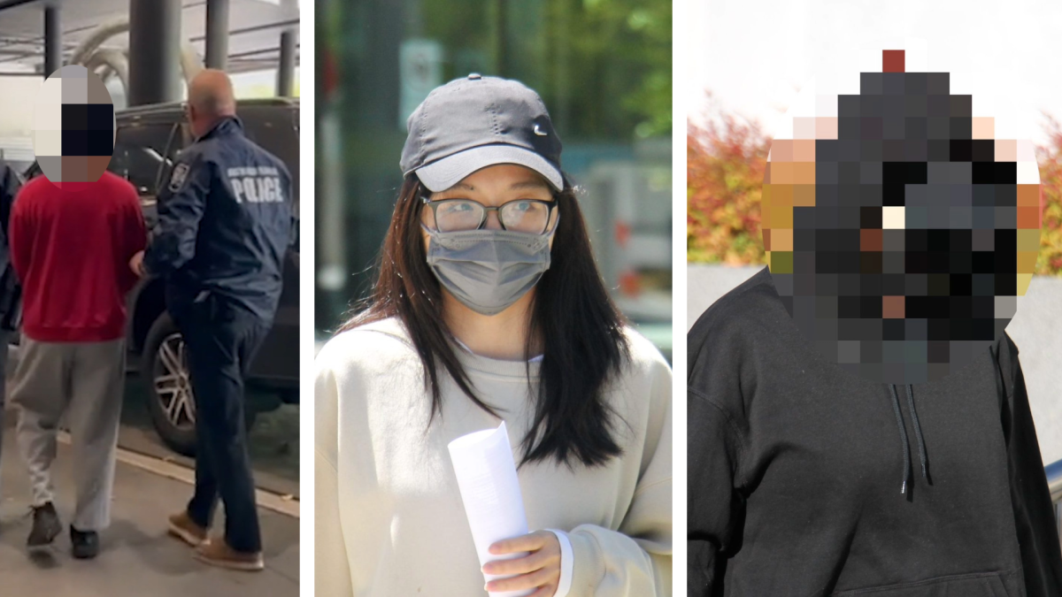 Siru Zheng (centre) is the only one out of her two co-defendants, a man (left) and the first woman arrested (right), who can legally be named. Photos: AFP/Albert McKnight.