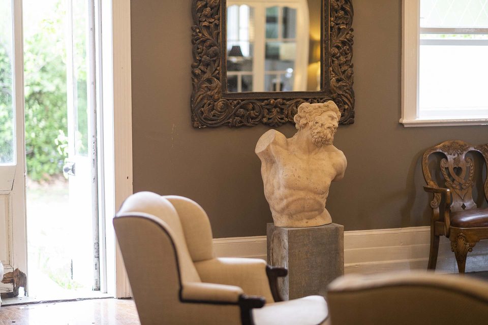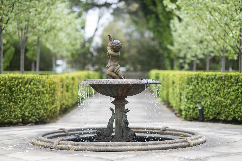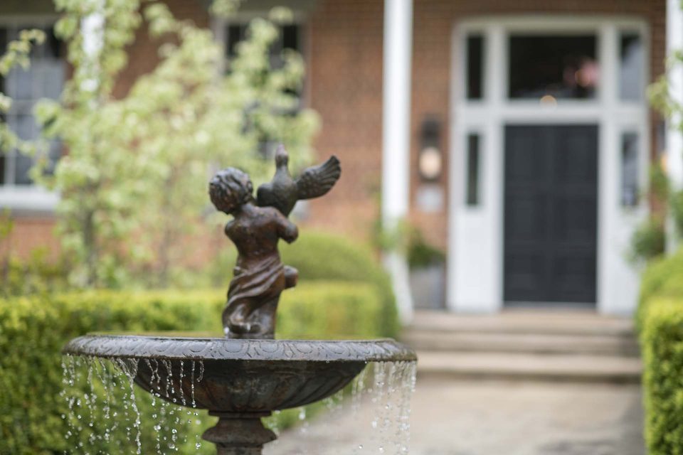 By the home’s entrance, a magnificent cherub water fountain serves as a centrepiece and ode to a bygone era.