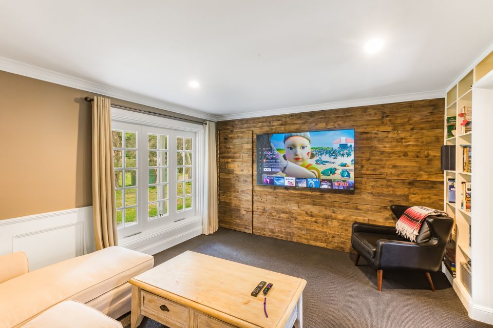 If you like dining, there’s plenty of space for a large formal setting, and two double sets of French doors lead out to the rear pergola and barbecue.