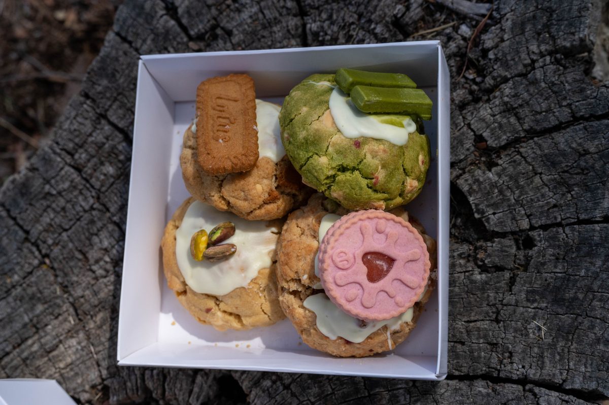 I taste Chanel’s four main cookie flavours. Cookies come in a minimum order of four. We get the mix box, featuring one of each flavour. The texture of the cookies is great, especially since they contain less sugar. Each bite is crisp and firm, yet without the brittle texture typically associated with a traditionally sugar-heavy cookie.
