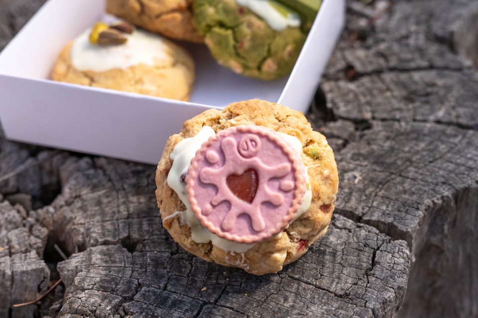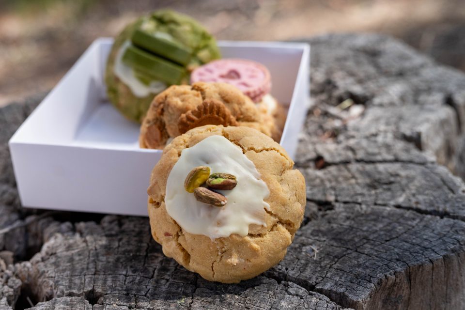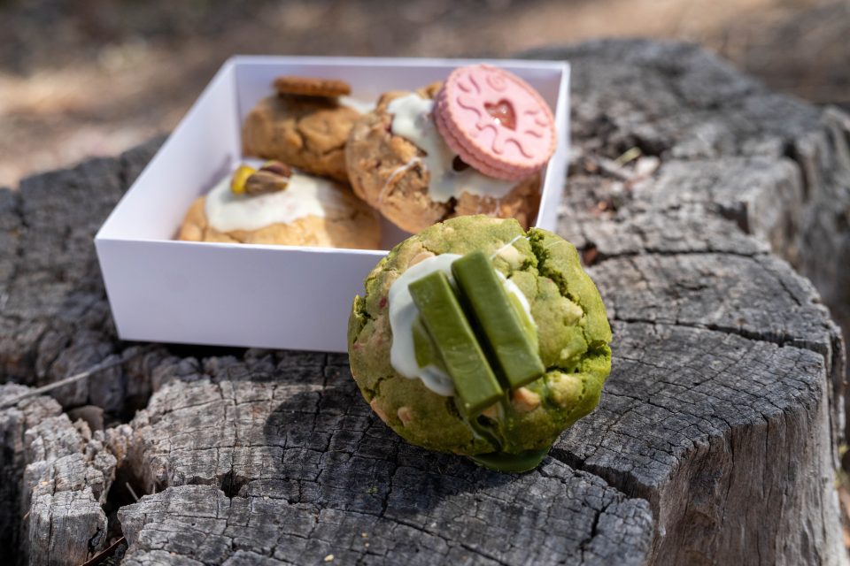 Pistachio Passion is a pistachio and white chocolate cookie with a pistachio cheesecake centre.