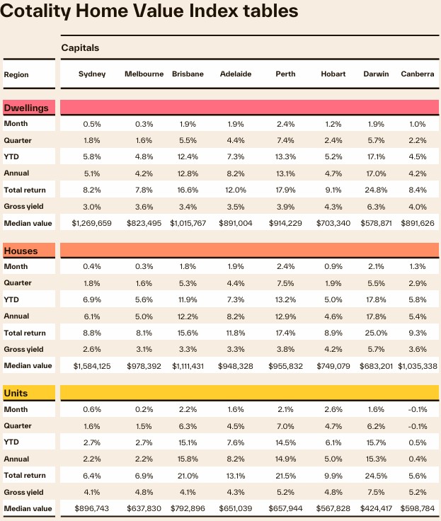Nationally, price growth in Sydney and Melbourne slowed, but the other capitals, particularly Perth, were strong performers.