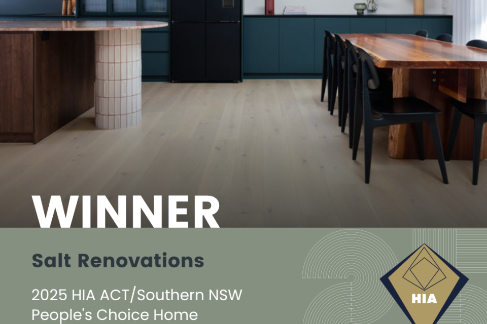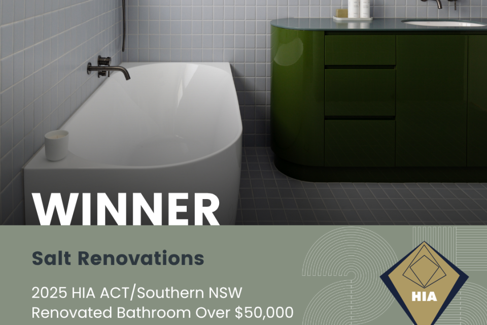 This experience has earned Salt Renovations a reputation for reliable work, open and clear communication and attention to the smaller details that other businesses may miss. This was evident as they were recognised at the 2025 HIA ACT/Southern NSW awards, winning Renovated Bathroom Over $50,000, People's Choice Home and being finalist for Kitchen of the Year.