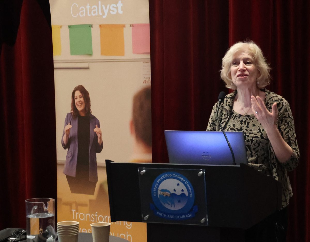 CECG Senior Officer Literacy Specialist Jessica Colleu Terradas talks with Natalie Wexler at the Think Forward Educators forum at St Mary MacKillop College.