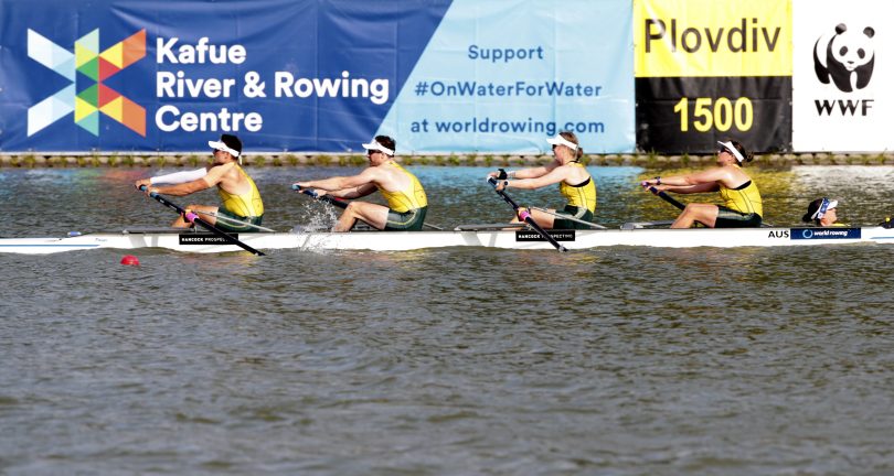 Nikki Ayers racing at the 2018 World Rowing Championships (in the bow seat).