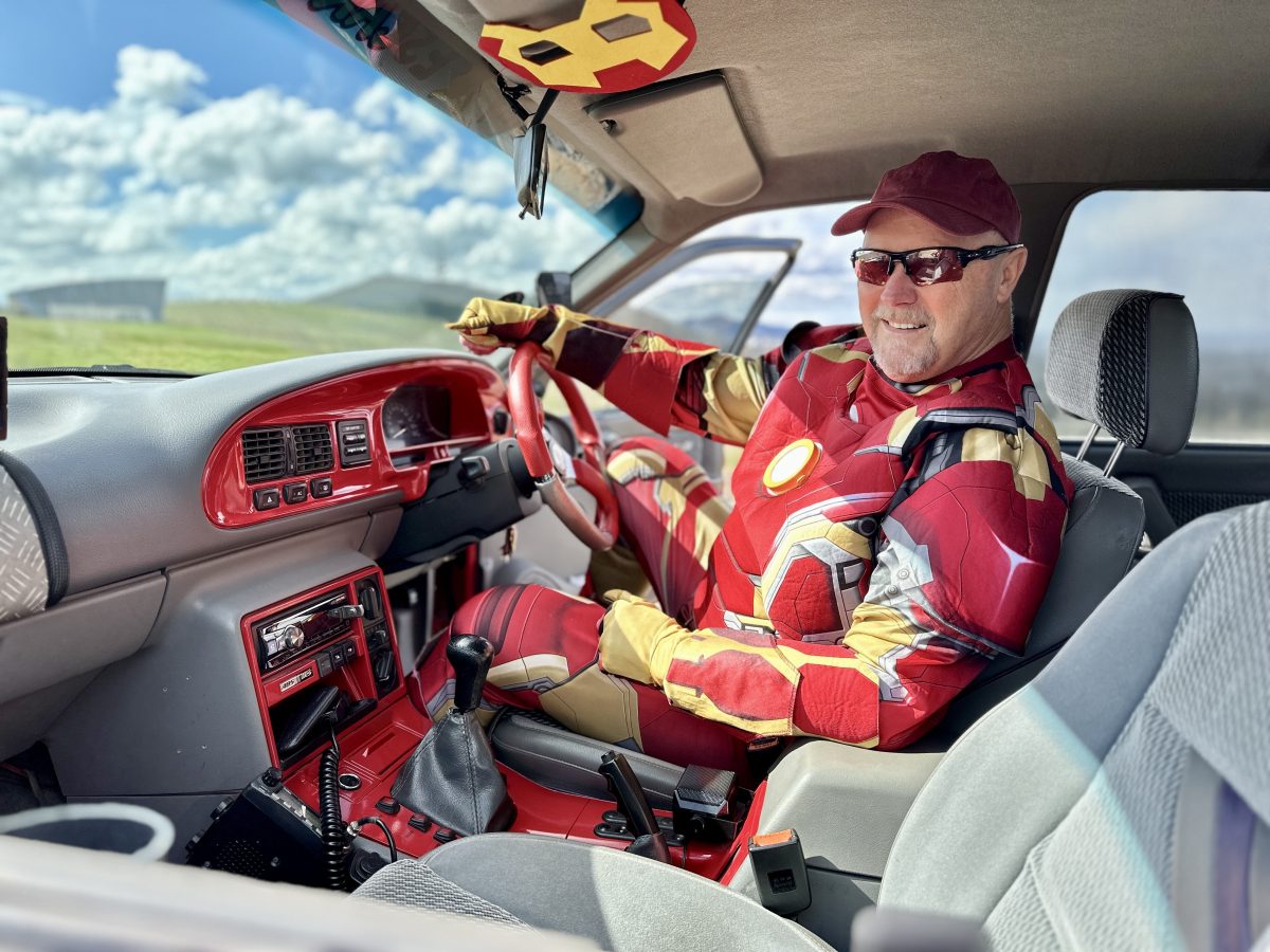 Adding colour will be Brett in his Iron Man costume, his wife Cathy as ‘Supergirl’, and their V8 Holden Clubsport, dubbed ‘Jarvis’.
