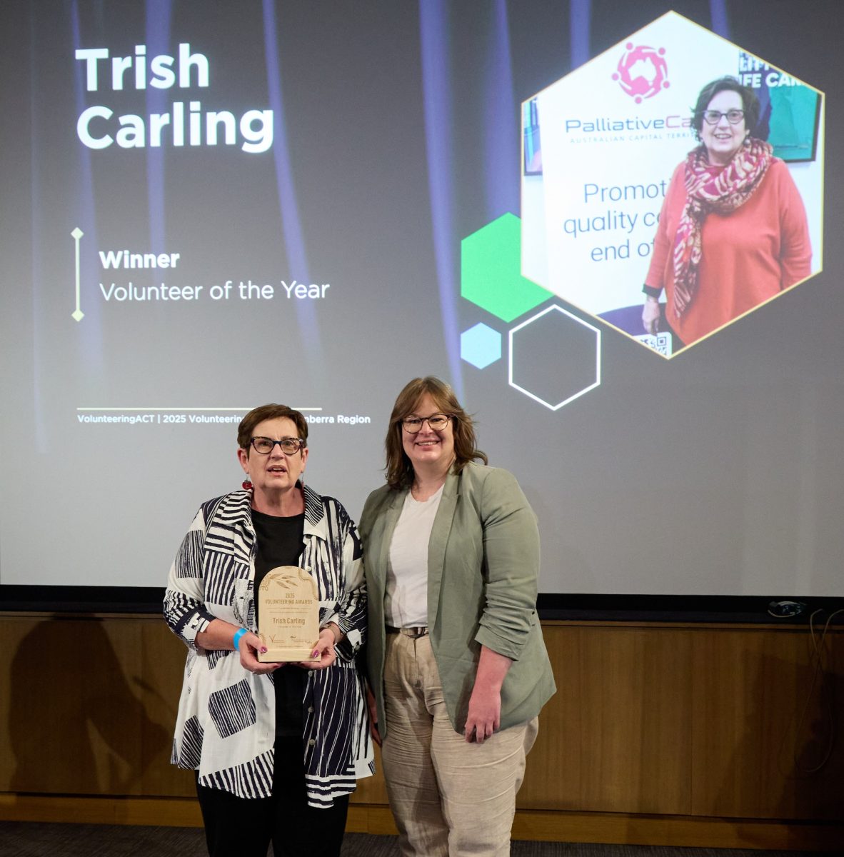 Earlier, from 2015 to 2017, she served on the Palliative Care ACT Voluntary Advisory Committee, helping advocate for volunteer needs in the sector.