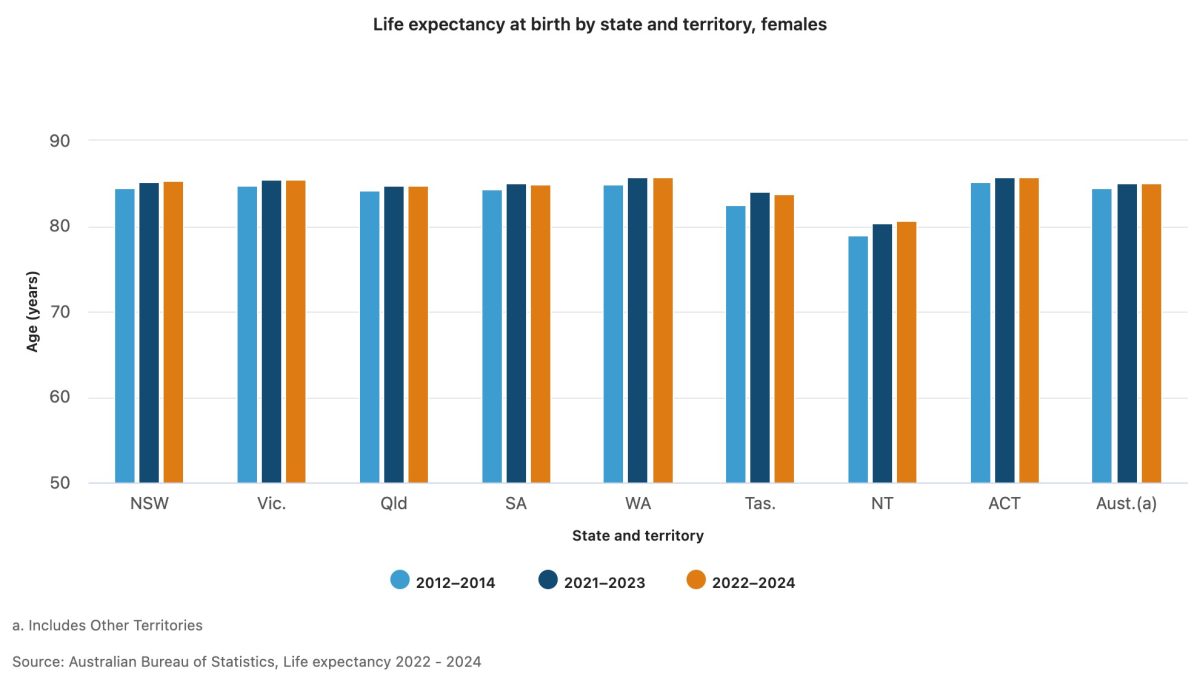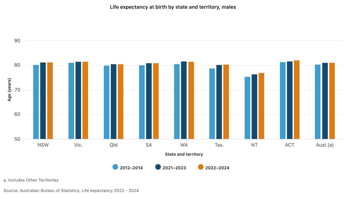 The ABS data shows life expectancy for the nation as a whole remained unchanged in the 2022-2024 period, compared to the previous three-year period.