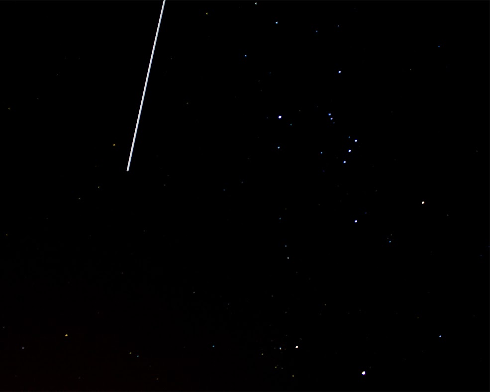 This is looking west, with the ISS passing the Orion constellation, with Rigel to the left and red giant Betelguese to the right, Jupiter at the bottom, and Aldebaran bottom centre.