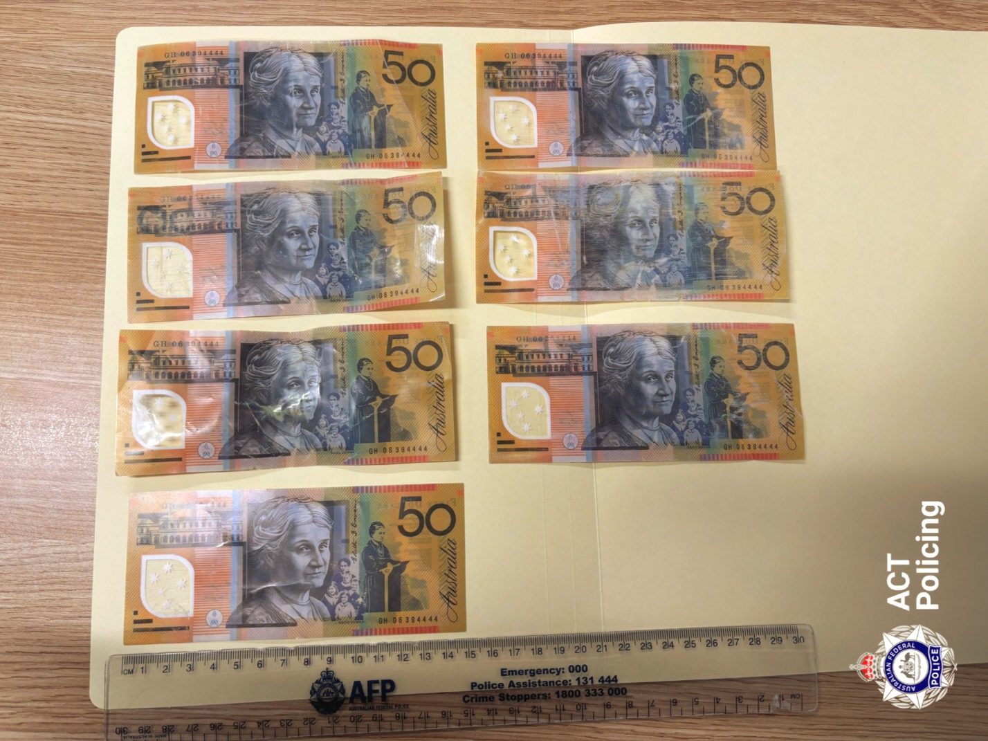 These seven alleged counterfeit $50 notes were seized by police on 12 November. Photo: ACT Policing.