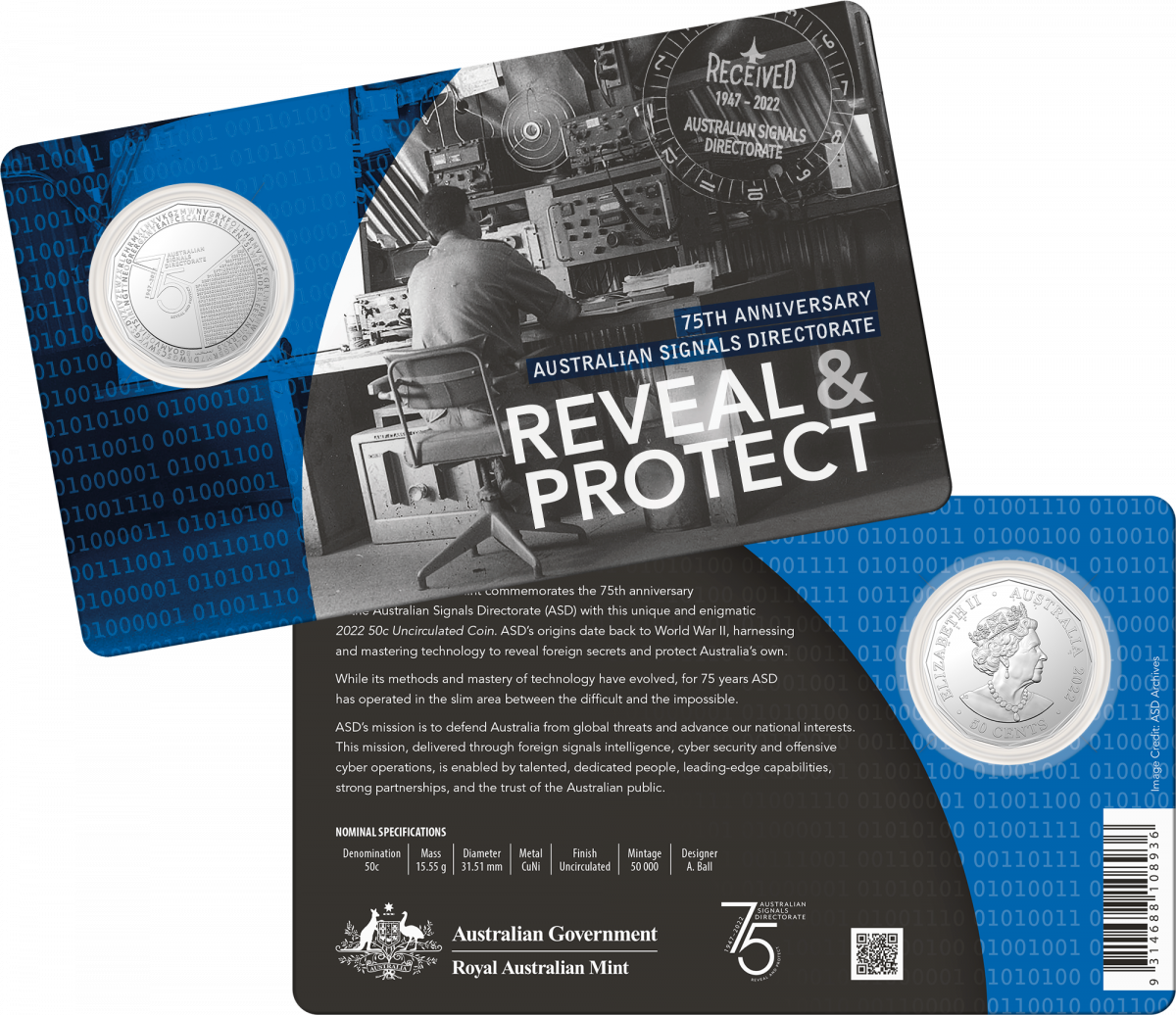 ASD is responsible for the country’s signals intelligence, cyber warfare and cyber security. Their cryptographic experts collaborated with the Mint to help design a coin with four unique layers of code that – if broken – contain two messages about the department’s work and history.