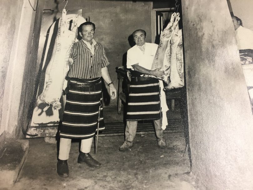Butchers Charlie Waterton and Allen’ Jockey’ Rudd with lamb carcasses at the Clinton Street butcher shop. Photo: Lionel Hart, Doughty family collection.