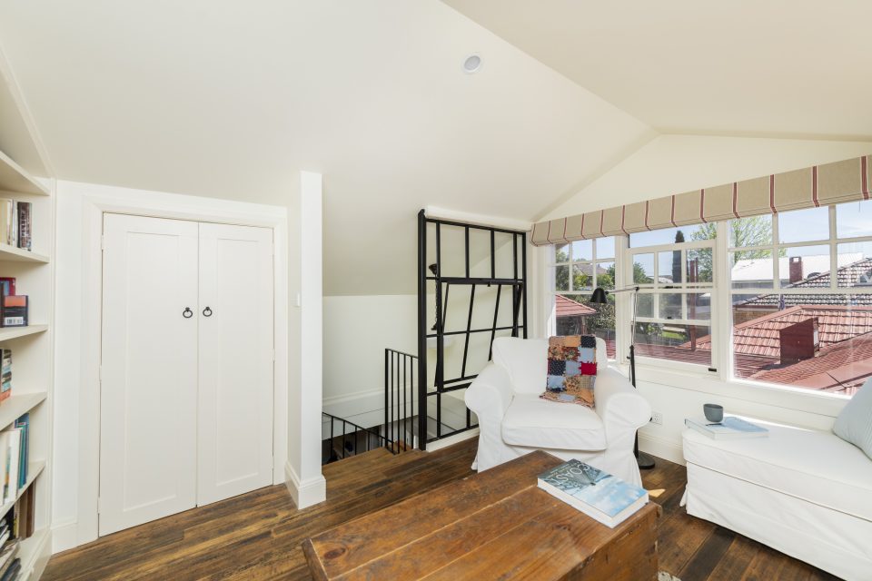 The Californian bungalow architectural style is ideal for attic conversions, with the pitched roof creating an opportunity to add plenty of space when renovated. The attic conversion in this home adds an enormous third bedroom, with a study nook, and a separate living room. The spiral staircase leads to the third-bedroom lounge, which is lined with bookshelves and beautifully lit through timber sash windows.