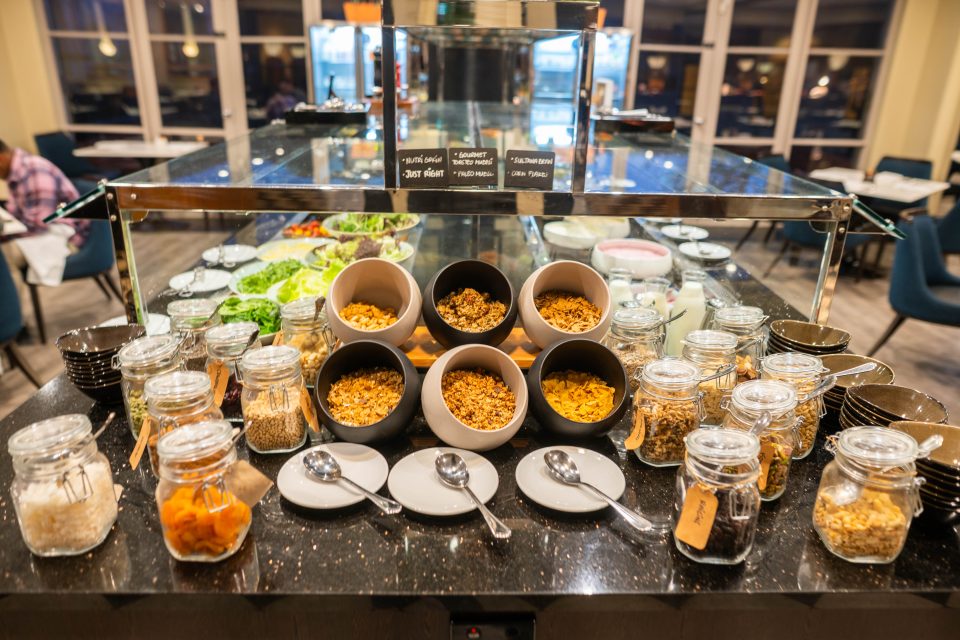 How good is Bircher muesli? Among the swathe of cereal options sits a tureen of creamy, soaked Bircher muesli, studded with goji berries and grated apple. A variety of add-ons includes not just fruit, but also a range of seeds and nuts.