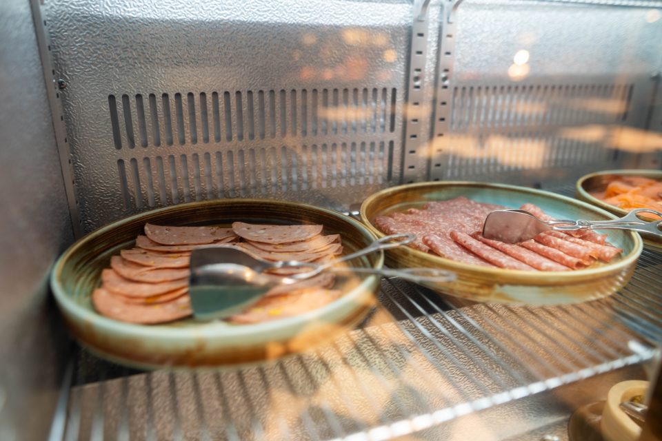 We select from a diverse array of charcuterie, including cream cheese marinated in Italian herbs, an assortment of cheeses, and dried fruits.