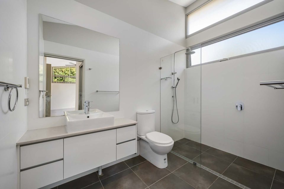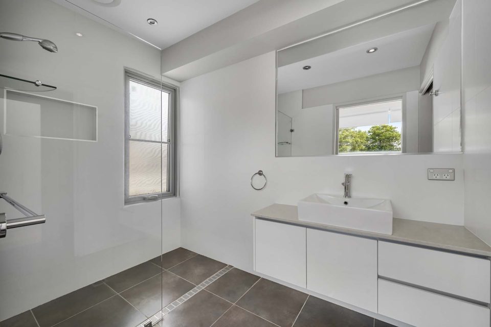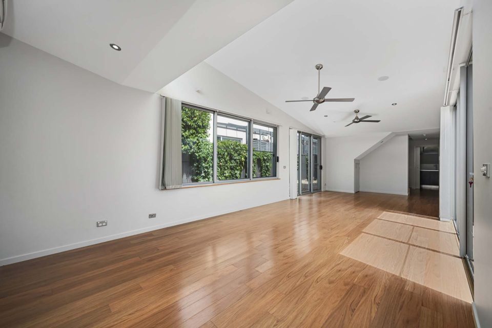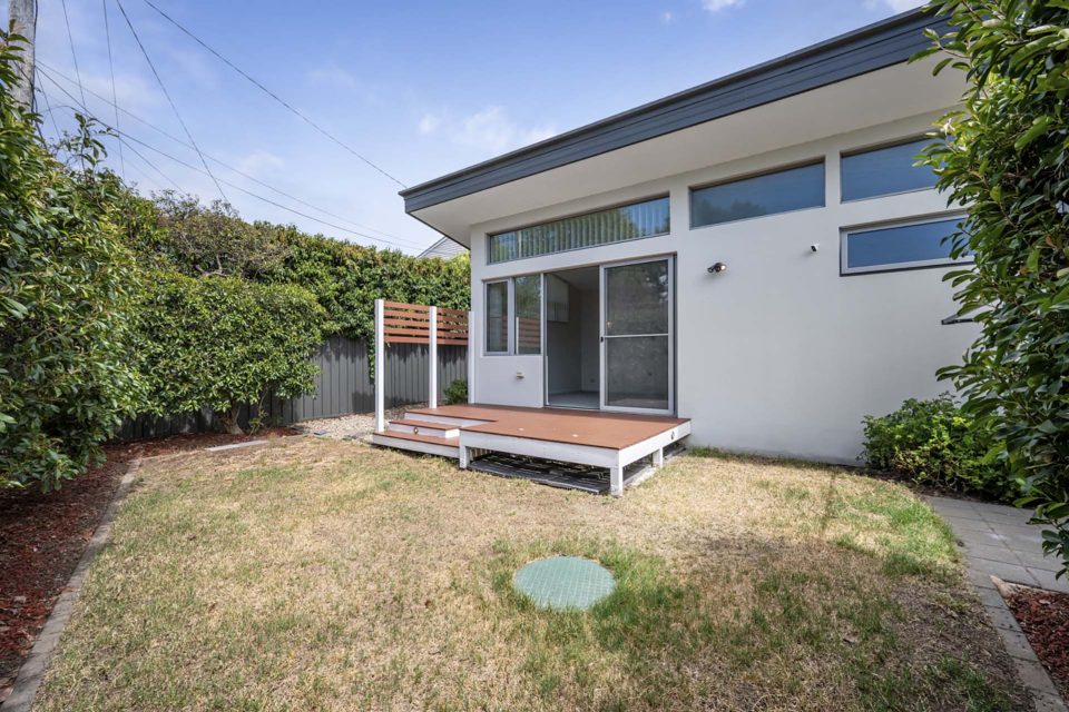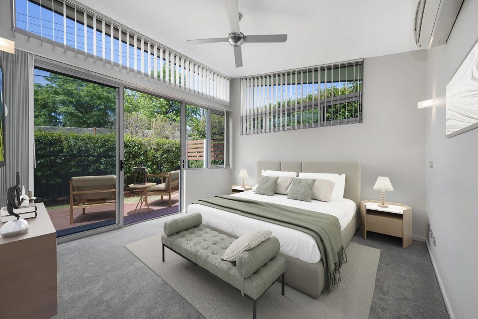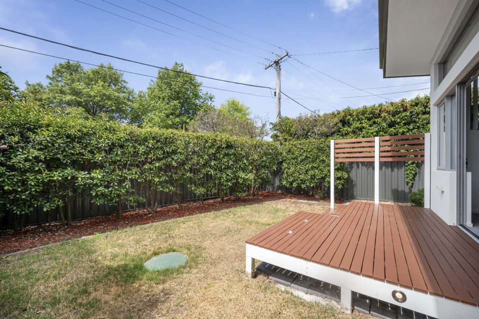 Expanding the master bedroom’s space is a private rear deck, easily accessed through large sliding glass doors and benefiting from northerly light. The deck is set in the low-maintenance, easy-to-manage garden.