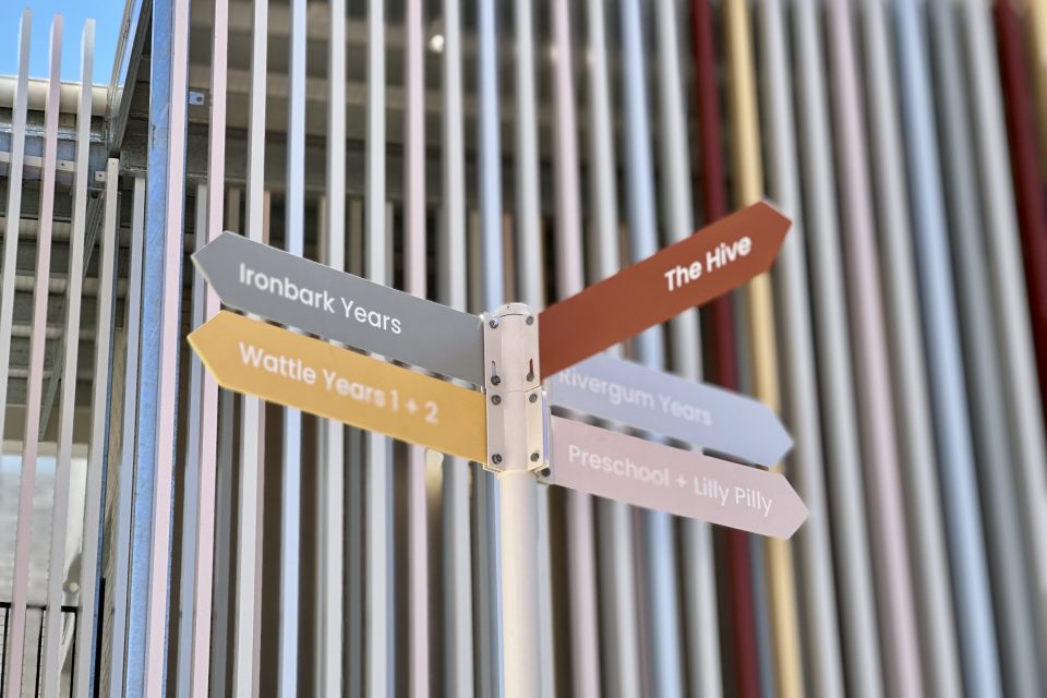 As a nod to its history, Canberra red bricks from a since-demolished building have been used as a feature of the site’s new hall. And those stripes of different colours in the metalwork and signage? That’s a combination of the theme colours for the school’s different areas.