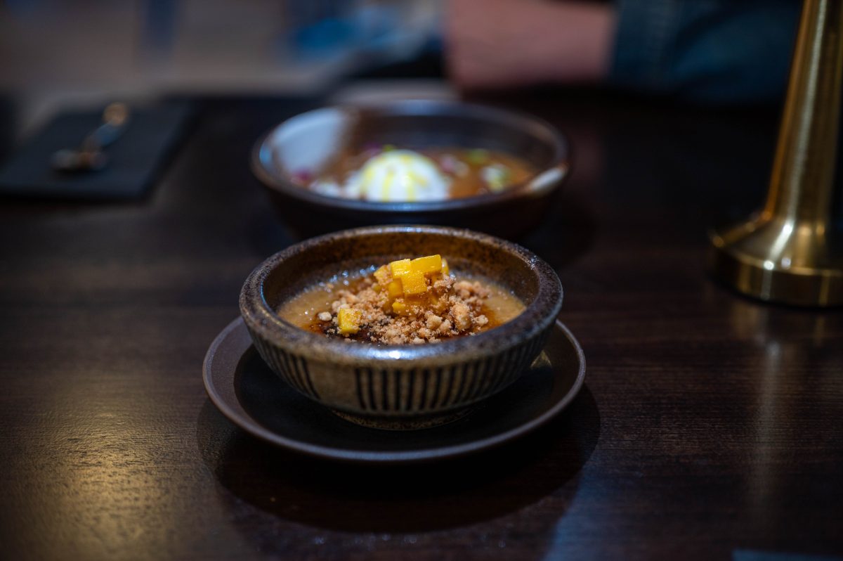 We are so glad our dessert stomachs have extra room. The main dessert, payasam, is chef Shaji’s indulgent taste of home from Kerala. This celebration dish is a delightful blend of flavours and textures, like walking down a market street in an Indian city! Fragrant, perfumed, saffron-hued custard, full of cashews, coconut chips and plump sultanas and something that feels like the bubbles in bubble tea on my tongue. A dollop of tart and tangy sorbet with a bright yellow drizzle of chilli oil sits on top. Chaotic and colourful, this is a scrumptious dessert.