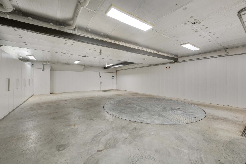 The garage also features a lift up to the ground floor, along with wall-to-wall storage space and a storage room.