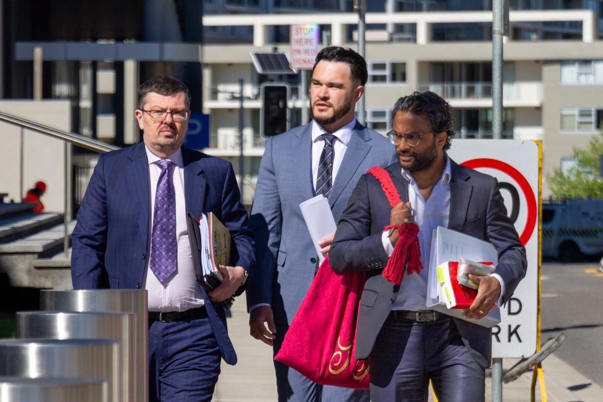 Matthew William Byrne (centre) arrives for a sentencing hearing with his legal team, Michael Kukulies-Smith of Kamy Saeedi Law (left) and Sam Pararajasingham SC. Photo: Albert McKnight.