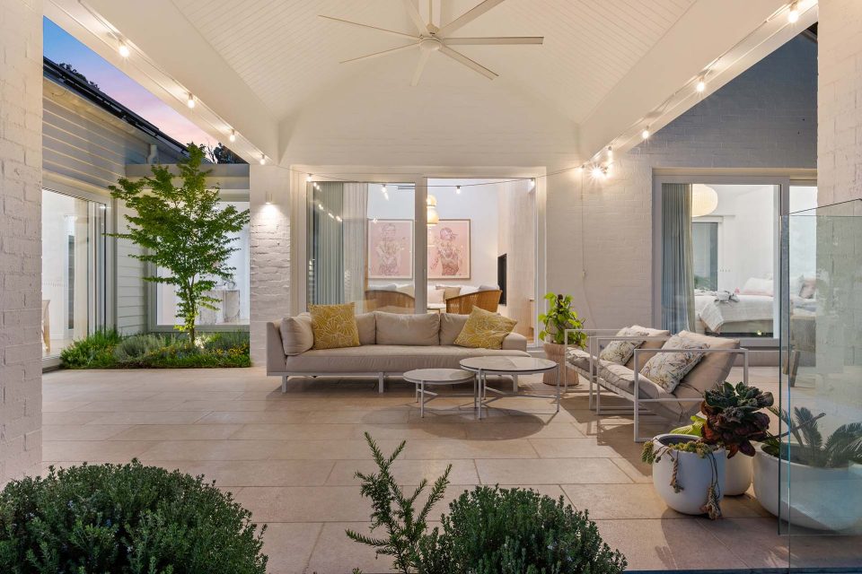 A focus on synergy between the outdoor space and indoor living is evident in the floor-to-ceiling sliding doors throughout the home and, though the home is open, privacy is easily achieved with linen sheers and stylish plantation shutters.