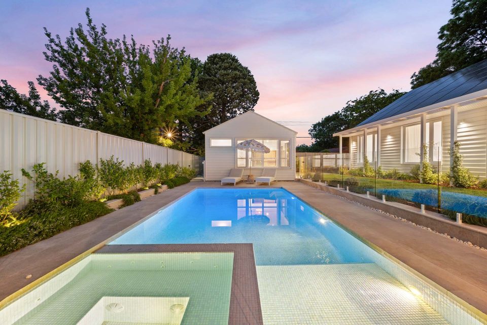 The outdoor space on this property is extensive, including a large alfresco dining area, a firepit, landscaped gardens and a heated magnesium pool and spa.