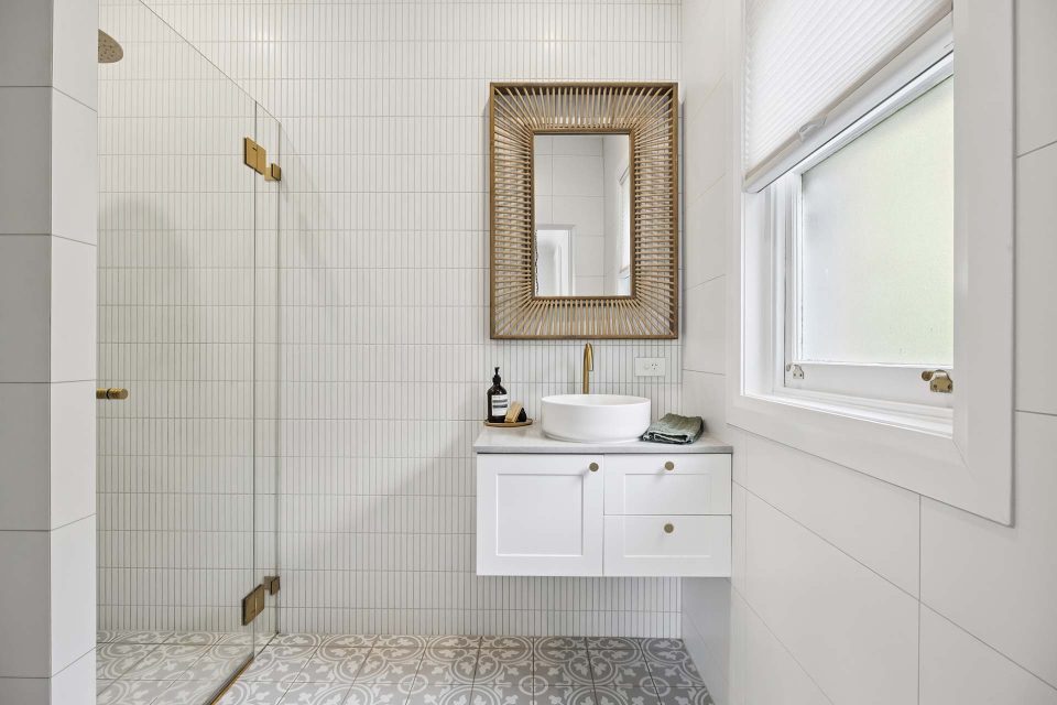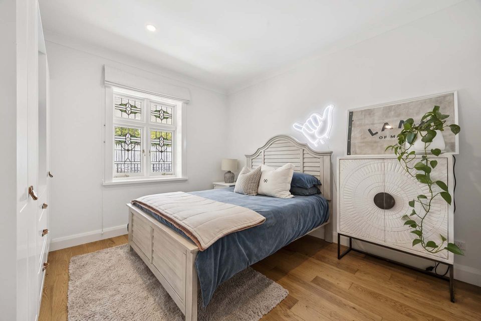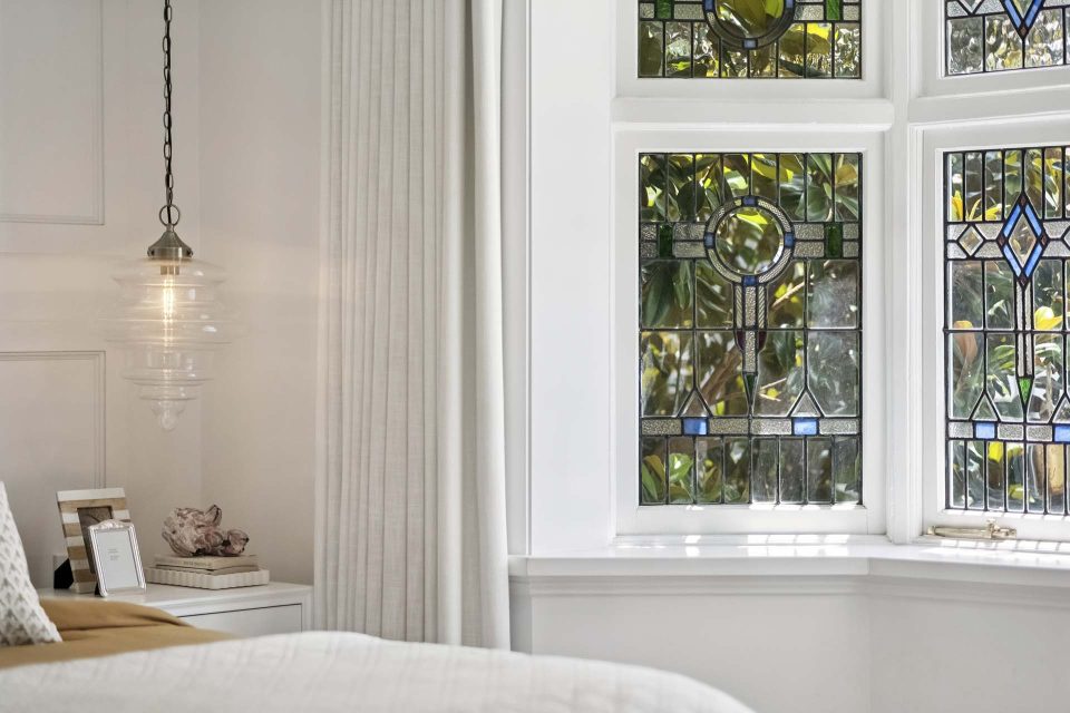 The primary residence includes three generous bedrooms, each with original leadlight windows and leafy views. Vibrant blue, red, and green designs catch sunlight and add a little bit of magic to every space.