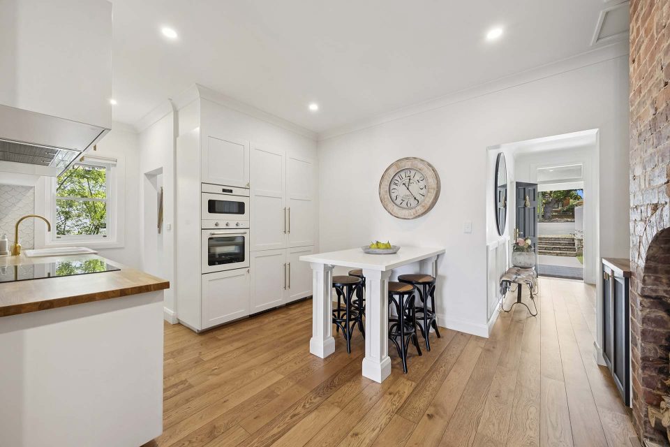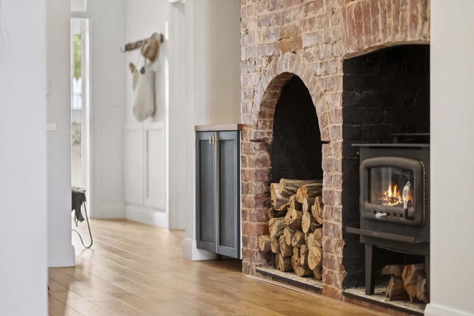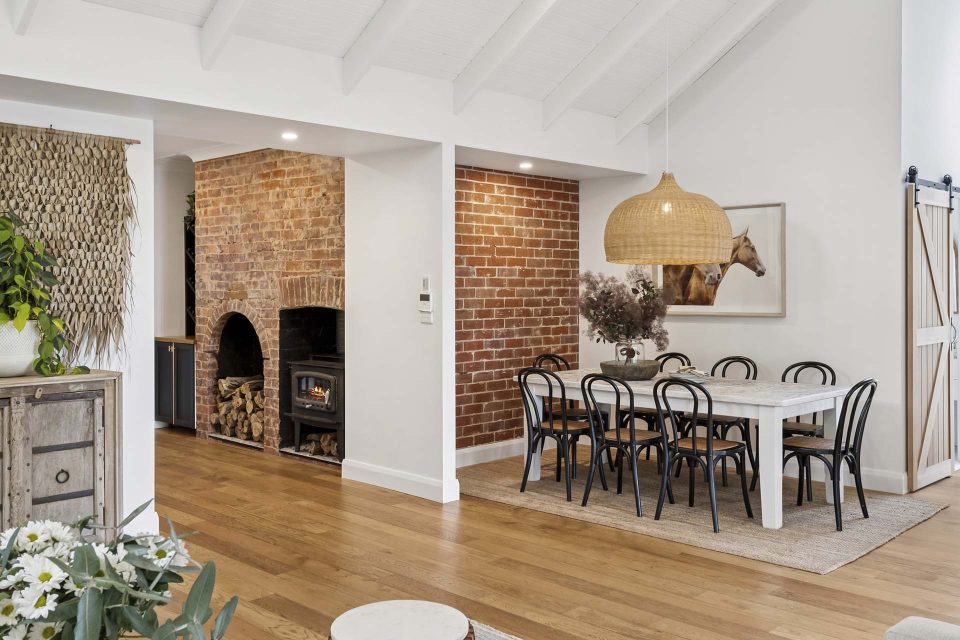 As they step over the threshold, visitors are led past original solid timber doors, exposed brick and a charming combustion fireplace into the kitchen/meals area.