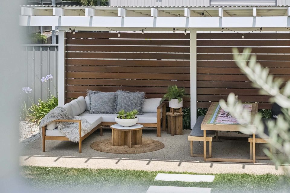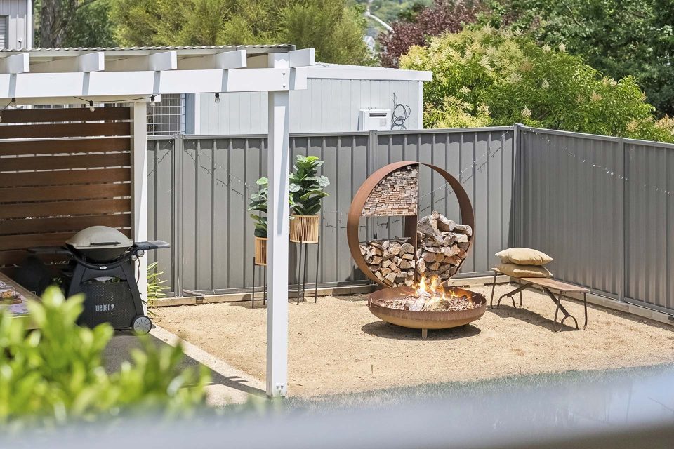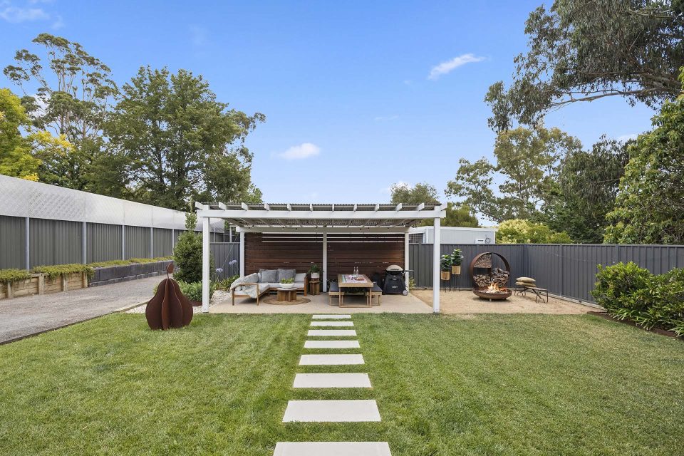 Lush, low-maintenance gardens frame the home. Large pavers lead across the established lawn to a covered alfresco area with an adjacent fire pit, perfect for evening entertainment.