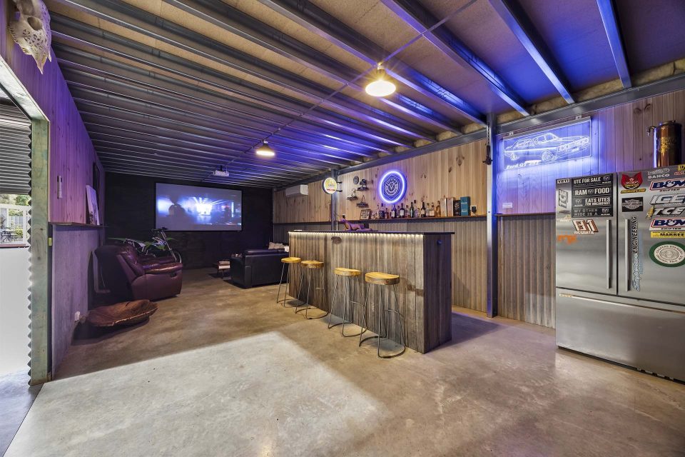 “It features a full bar and ‘man-cave’ with a cinema-scale projector and screen, plus mezzanine storage, and there’s still more than enough room for six cars or a home workshop in the garage portion.”