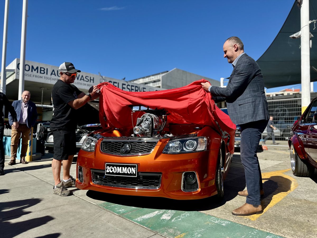 ACT Chief Minister Andrew Barr joined the Tamworth owner in revealing the 2008 Holden VE Commodore SS ute outside the Waves Car Wash in Braddon – one of more than 3000 cars entered into January’s Summernats.