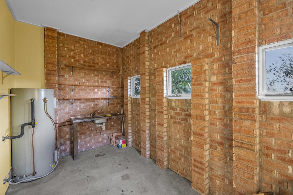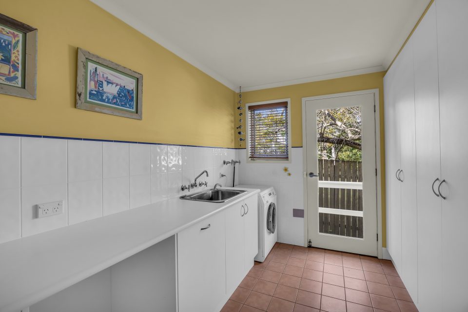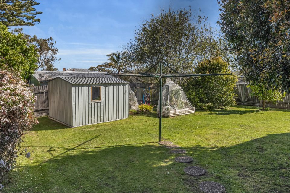 The backyard itself is large and thriving, with lush grass for kids, grandkids and pets to play on, as well as a little garden shed, veggie bed, and a classic Hills-Hoist-style clothesline.