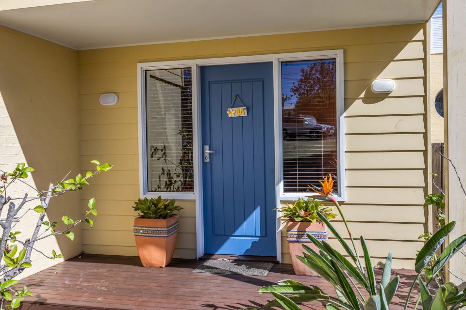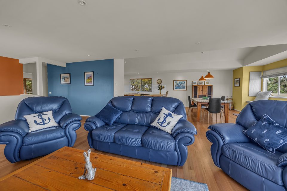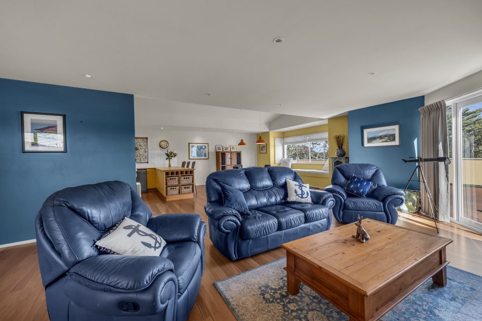 Stepping past the ocean-coloured threshold, visitors are led upstairs into a comfy living area. Soft blue walls and polished timber floors bathed in natural light create a peaceful atmosphere ideal for spending quality time with loved ones.