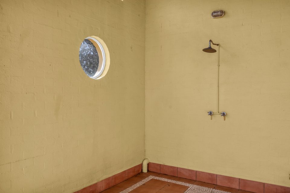 Tucked into an alcove, facing the backyard, is a tiled outdoor shower, perfect for a quick rinse after the beach.