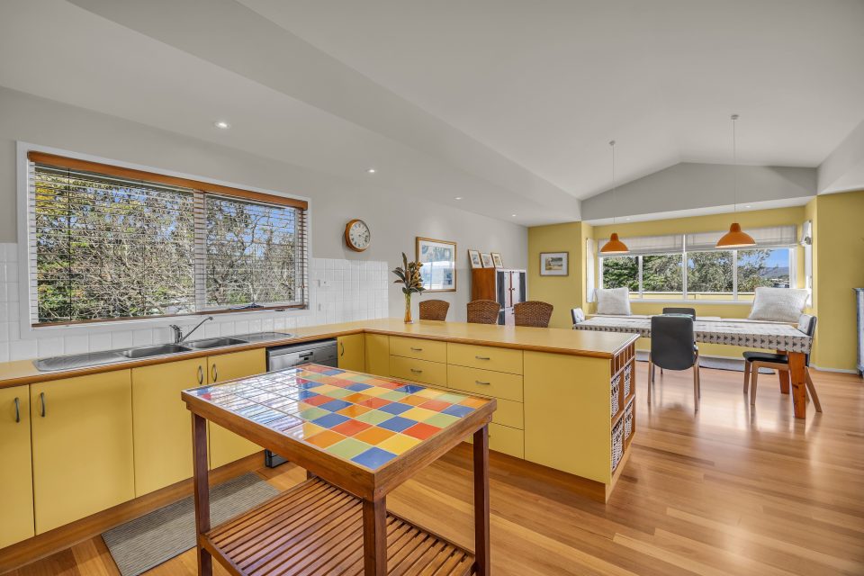 The open-plan kitchen and dining space continues the pastel-yellow theme. Storage won’t be a problem in this kitchen, which also has a handy breakfast bar for casual meals.