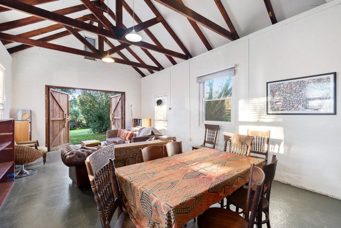 The bungalow is a self-contained home with barn doors, a living/dining area, a small kitchen, a lovely bedroom and its own bathroom. The bedroom also houses a study area, and has a wall of bookcases, perfect for a library or studying or working from home.