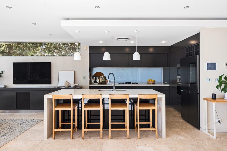 Open-plan living spaces flow effortlessly into the premier kitchen, which features top-of-the-line Miele appliances, stone benchtops and custom cabinetry.