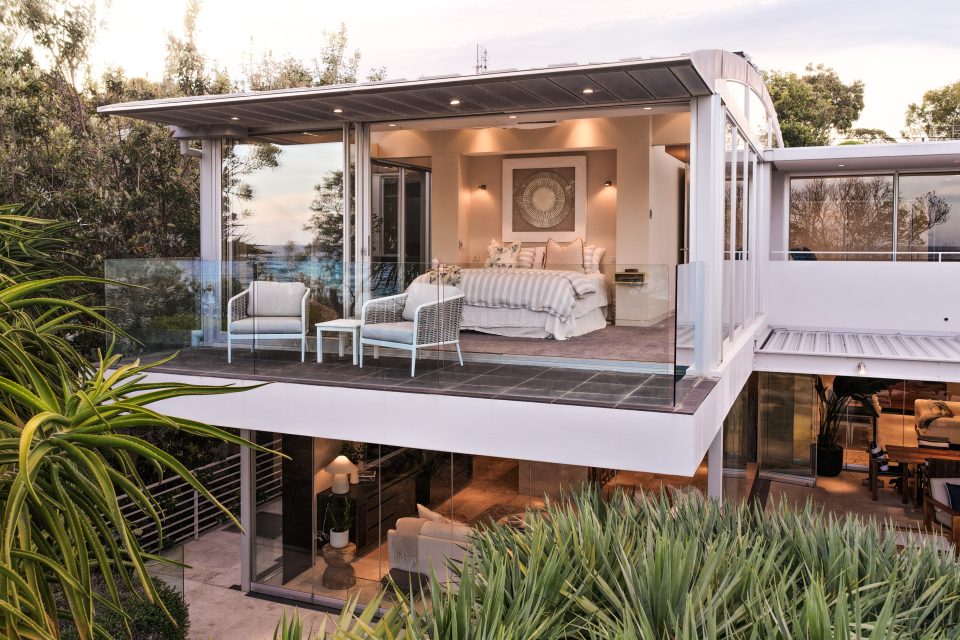 Up on the top level are four large bedrooms, each with its own bathroom, and three with balcony views. The master enjoys a huge walk-in robe, spa-style ensuite, and sweeping views up the coastline to nearby Bannister Head.