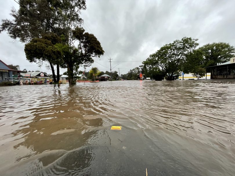 Water covered the highway and reached the doors of numerous shops as Cabbage Tree Creek which runs through Mogo, breached its banks last night.