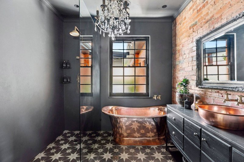 A jaw-dropping bathroom renovation includes Astra Walker copper tapware and a freestanding copper bath, while the former meat room has been transformed into a functional media retreat.
