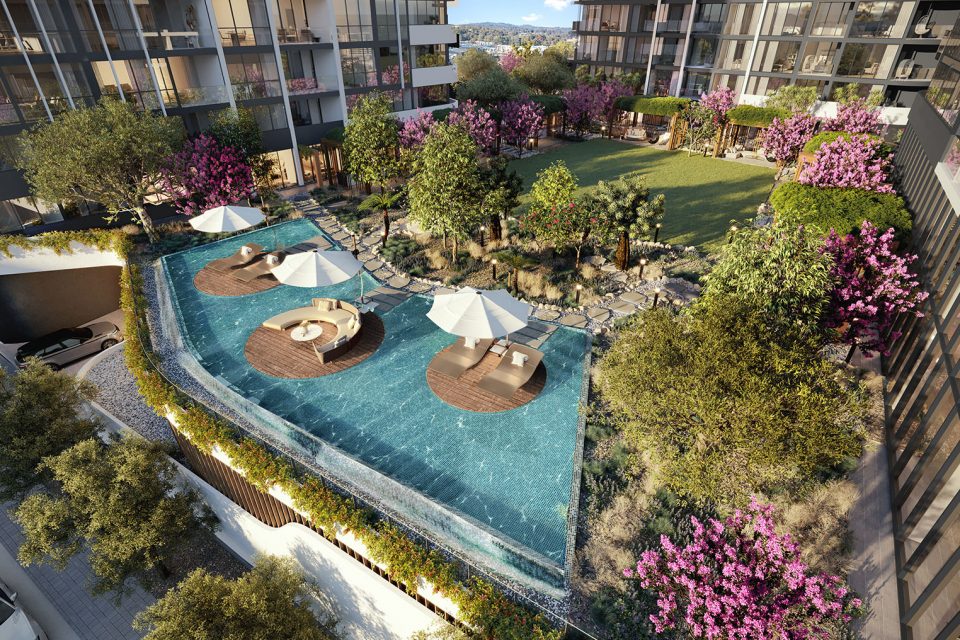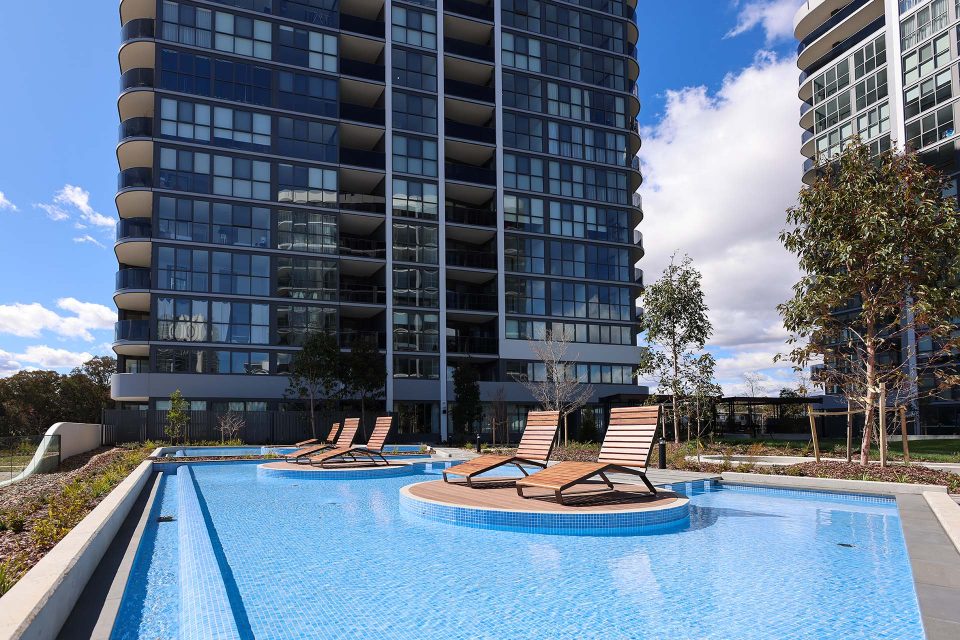 Woden Green’s communal space boasts 80 to 90 large trees, 7000 to 8000 plants and shrubs, all centred around a lawn with lounges and water features.