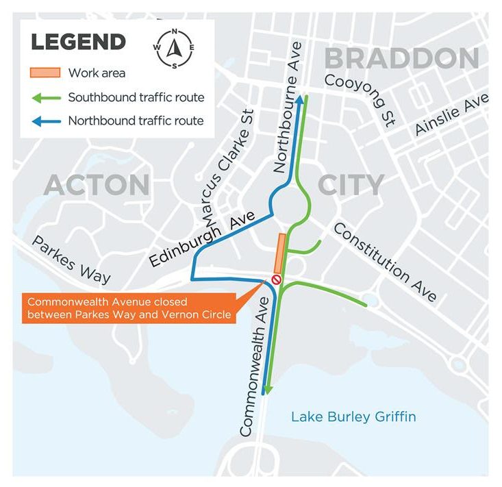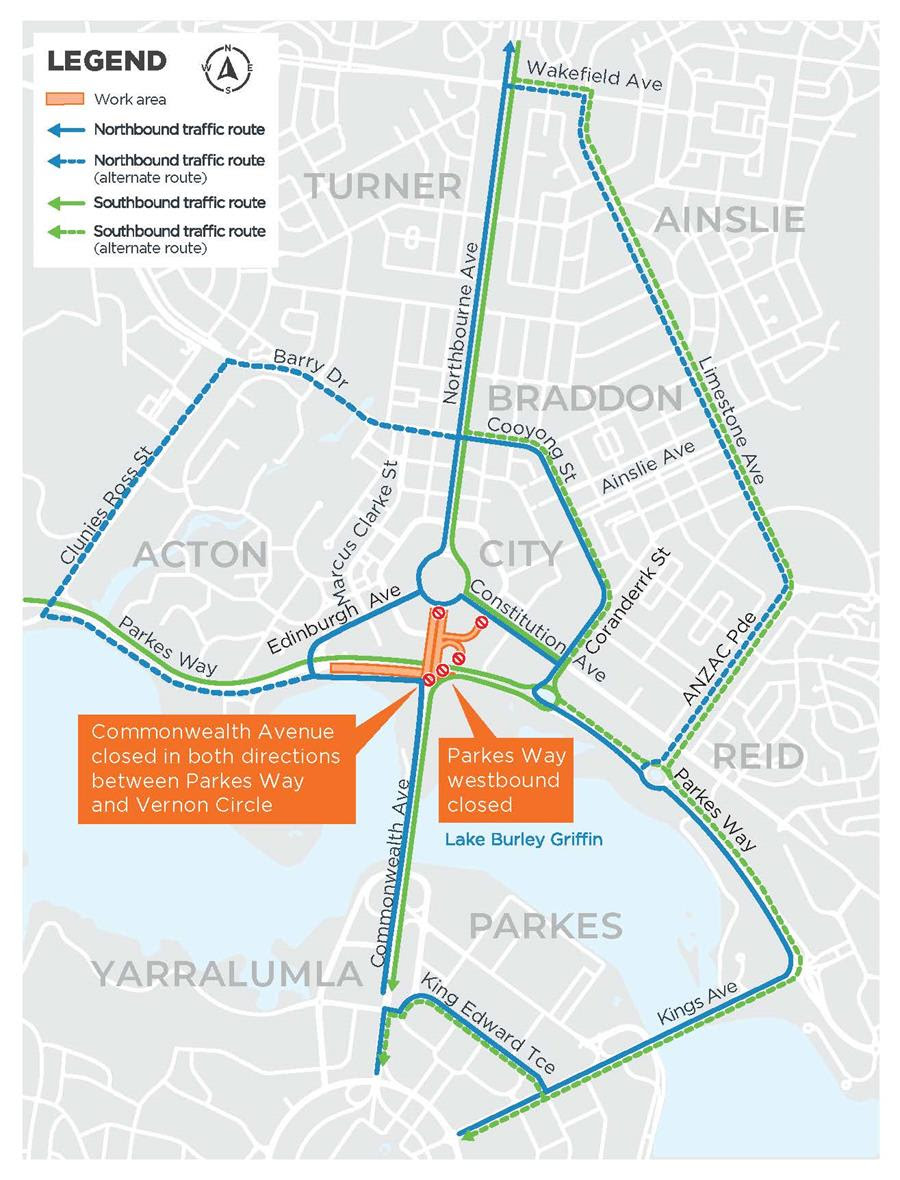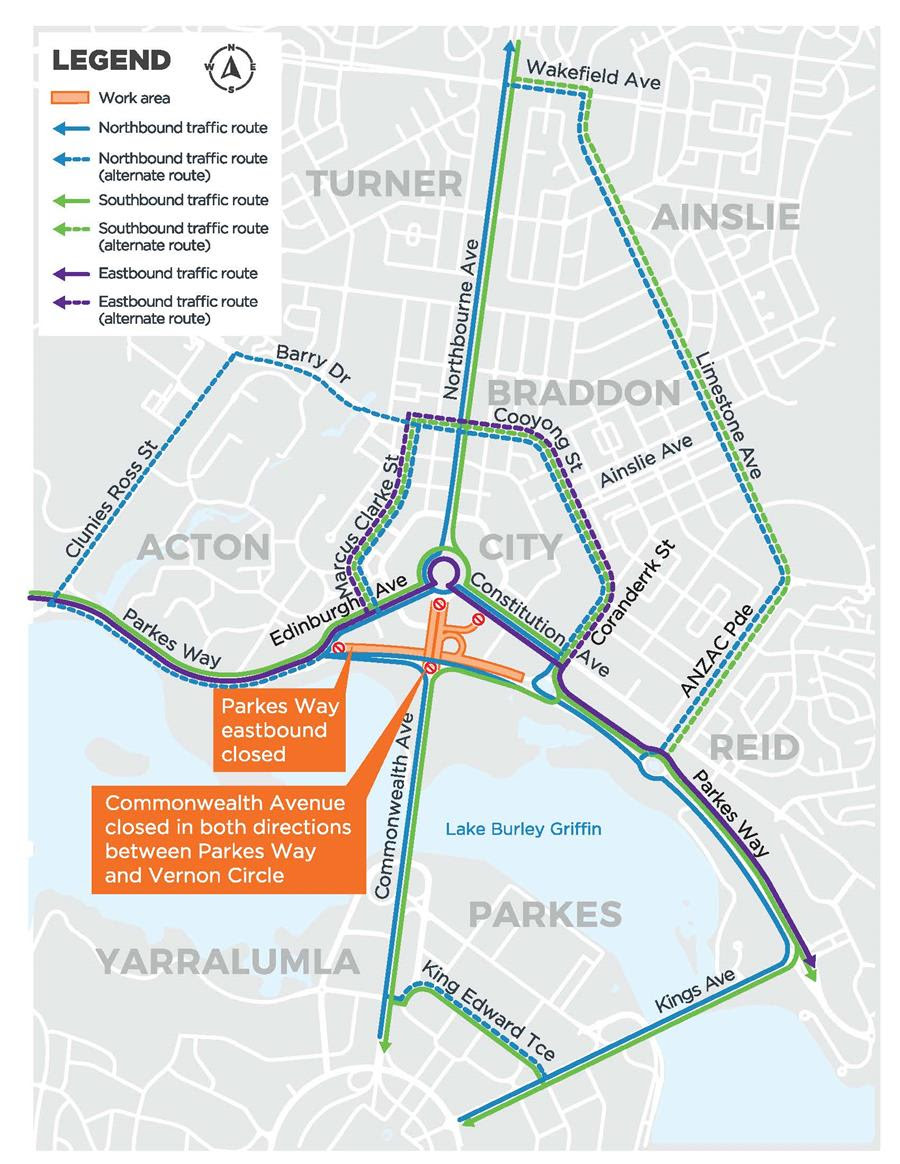 That night, Parkes Way eastbound will close between Edinburgh Avenue and Coranderrk Street.