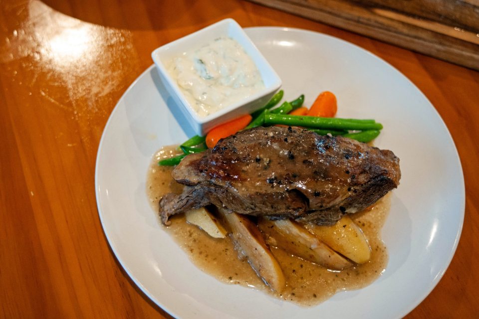 A rustic plate of slow-cooked lamb is the first main. Generously portioned and butter-knife-soft the lamb’s flavour infuses the gravy drizzled over thick potato chunks and greens.