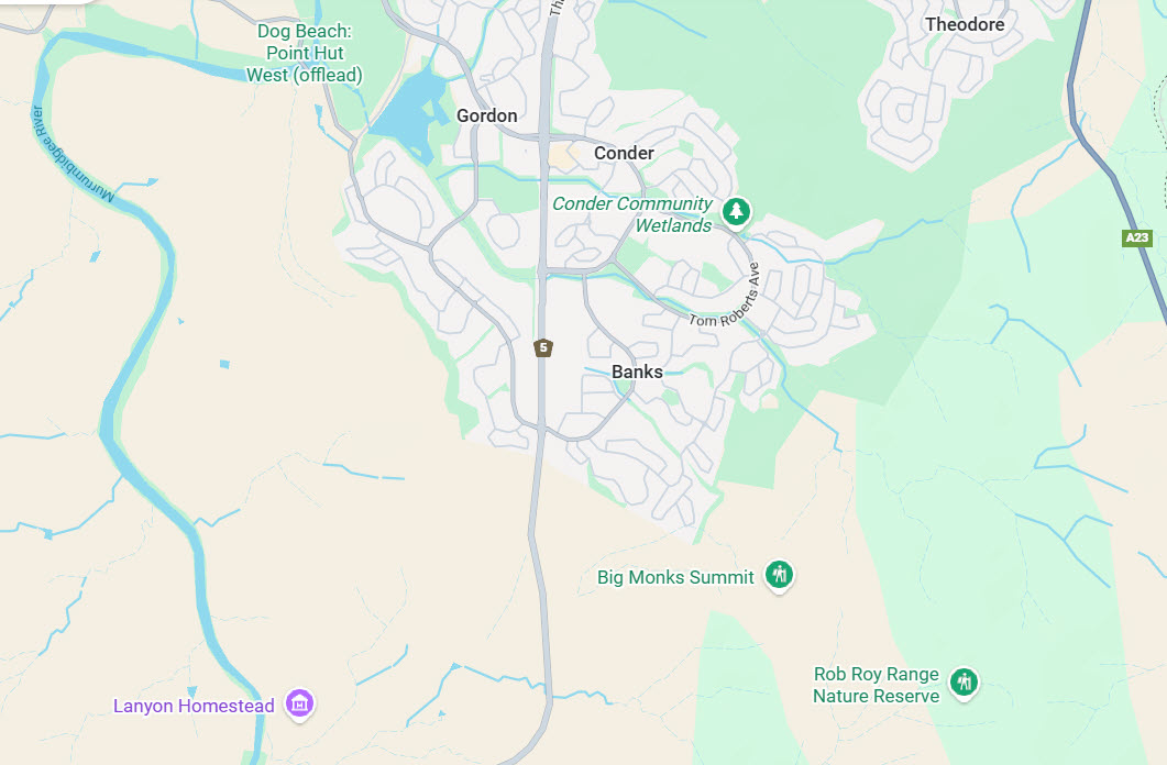 A map showing Lanyon Homestead’s relation to the southern-most suburbs of Gordon and Banks. Image: Screenshot, Google Maps.