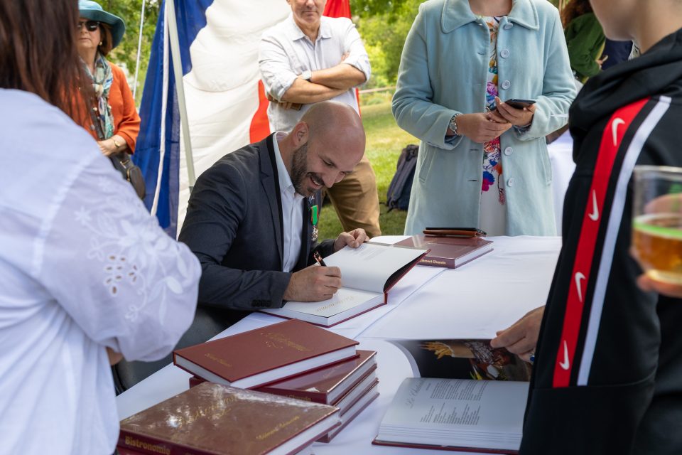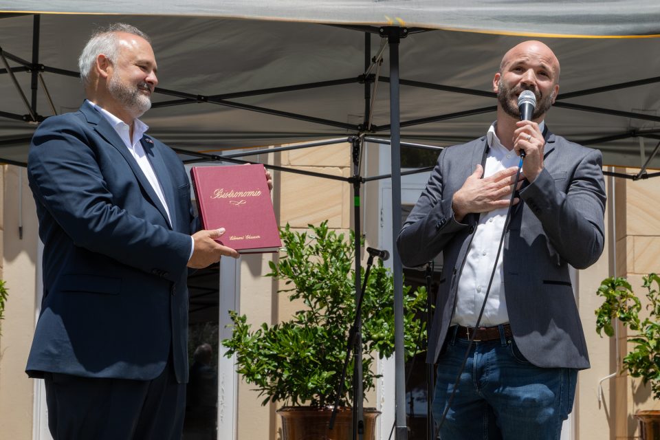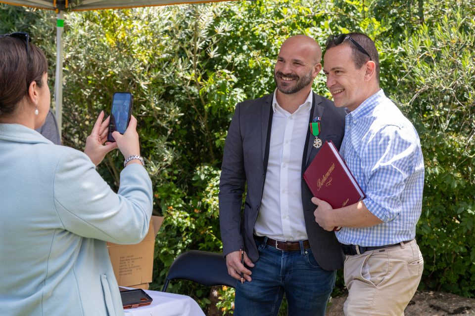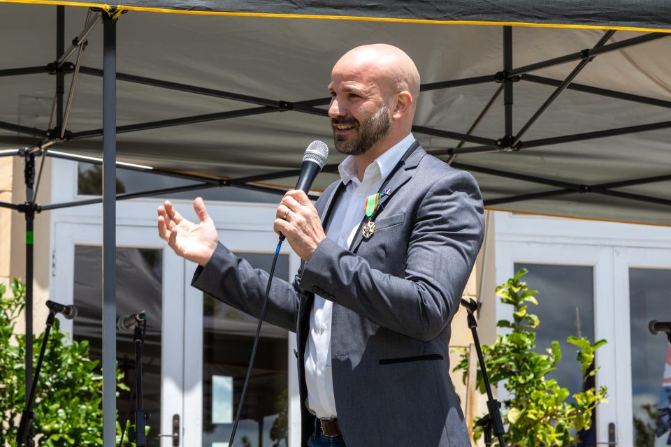 Clement Chauvin received the French Order of Agricultural Merit from Pierre-André Imbert at the Sound of French Summer event. Photo: Michelle Kroll.