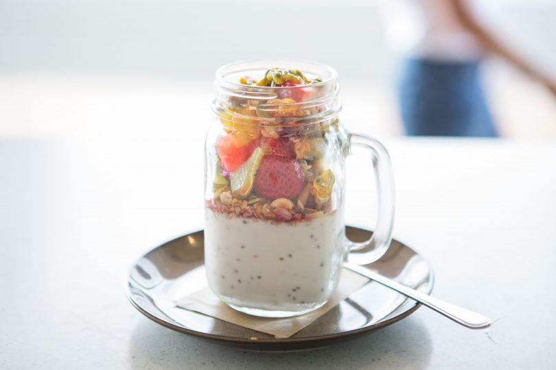 Chia Seed Coconut Yoghurt Pot with seasonal fruit.